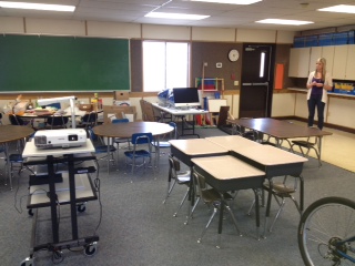 Today I spent my third attempt at arranging student seating. It is difficult because I am using 2 circle tables, 2 rectangle tables, and 2 groups of 4 desks. I am trying to arrange these around the ELMO so when kids are at their seats they can see the screen. After input from 3 teachers and my daughter, this is what I have come up with so far. Next week I will be able to move shelving on the wax floor and will actually get to see if it still looks good!